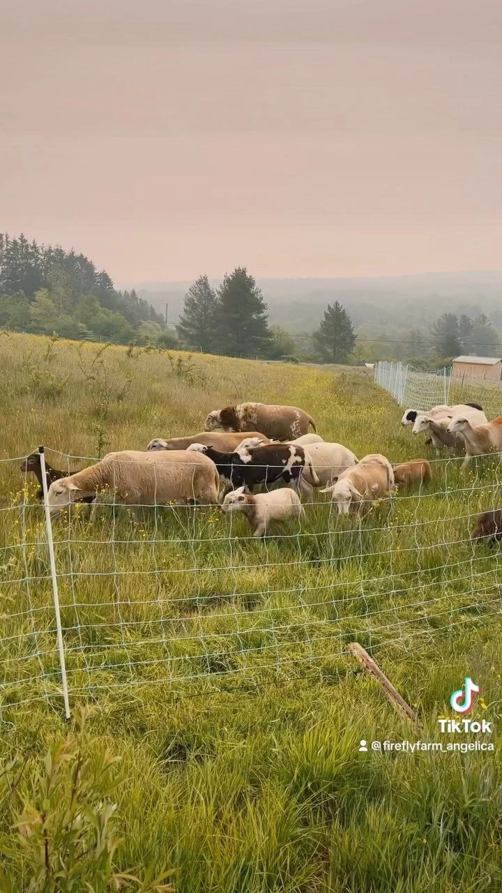 Our sheep live a natural life, grazing on pastures and benefiting from our rotational grazing practices. We move them every 1-3 days during the warmer seasons using portable electric netting for both their health and the land. We over-winter our sheep in shelters close to the house, with access to heated water.